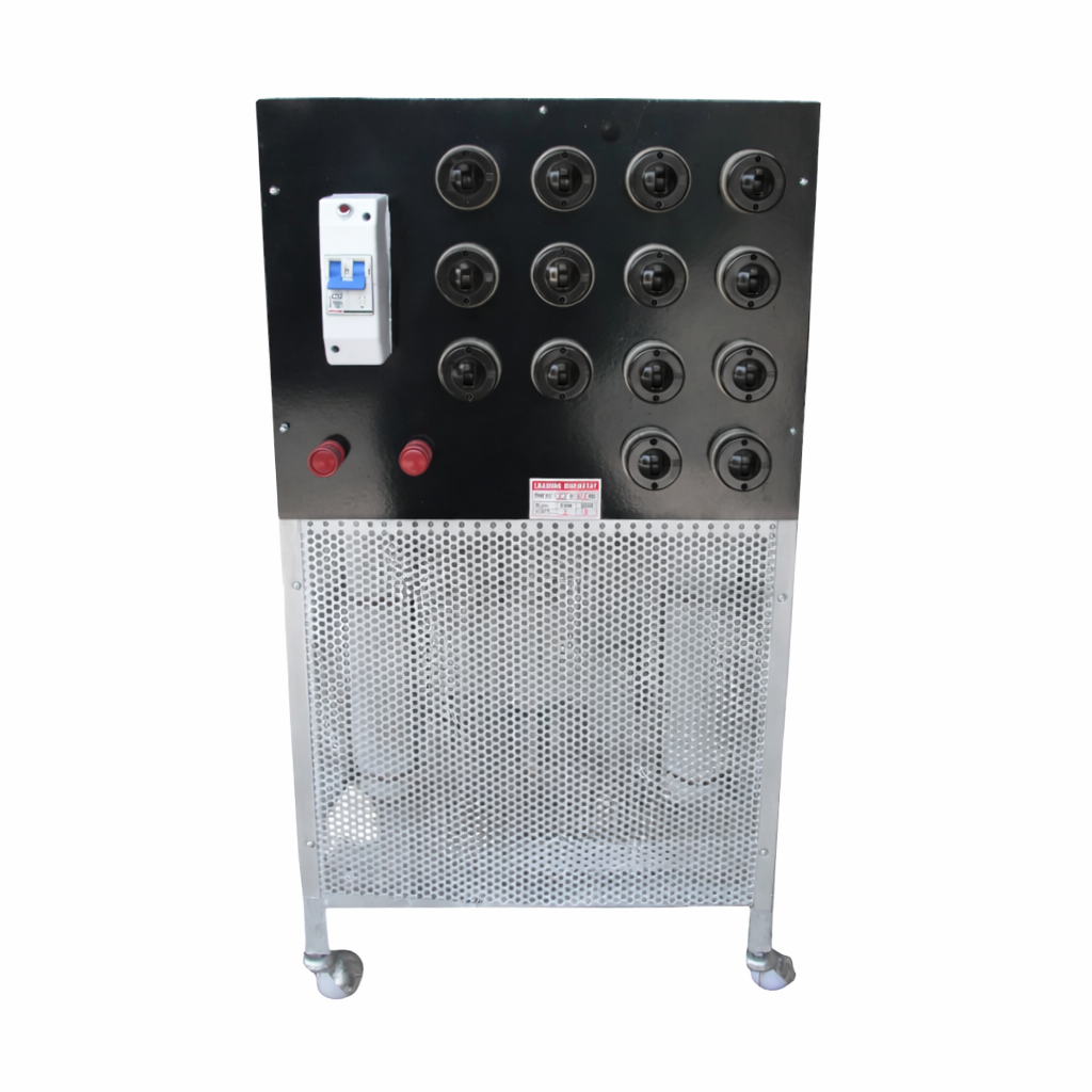 ELMO Single-Phase Resistive Load Bank, also known as a Loading Rheostat 6.5KW Bank, is a high-power resistance network designed for testing single-phase power supplies and generators. It allows accurate performance evaluation by simulating controlled electrical loads, which is essential because real operating loads are often unpredictable and variable. The unit is built inside a robust enclosure and features 14 switched resistive load banks for precise load control.