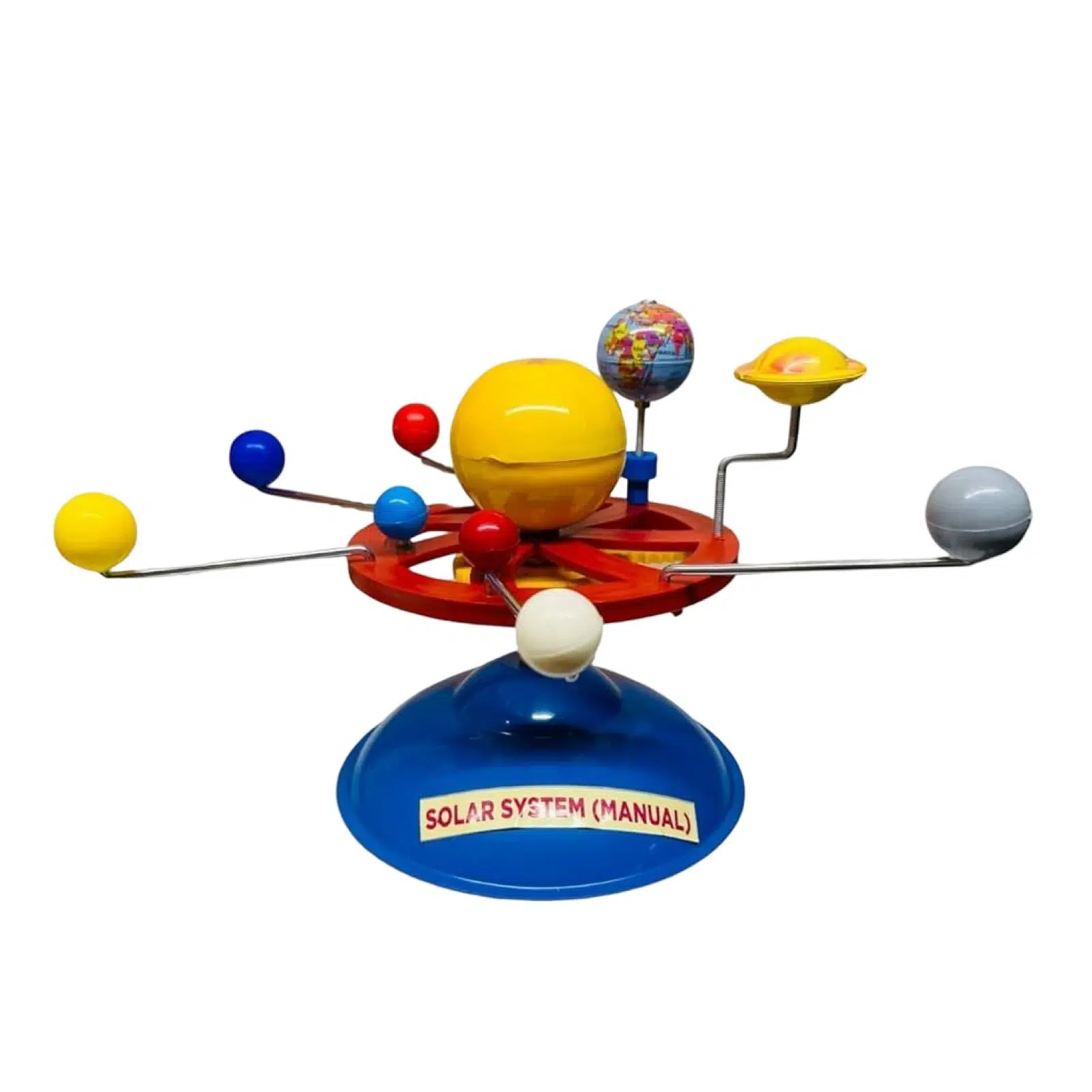 - Operated manually with rotating planets, it includes the Sun and planets on a sturdy base.